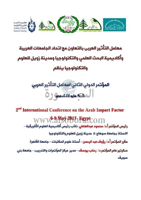 سيعقد اليوم المؤتمر الدولي الثاني لمعامل التاثير العربى بمدينة زويل بالتعاون مع اتحاد الجامعات العربية وأكاديمية البحث العلمي والتكنولوجيا ومدينة زويل للعلوم والتكنولوجيا