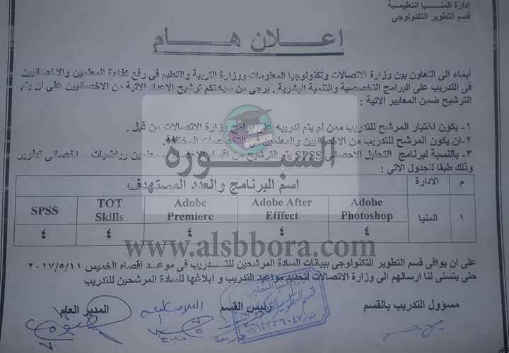 أرسلت وزارة التربية والتعليم والتعليم الفنى خطابا الى المديريات والادارات التعليمية بشأن ترشيح عدد من الاخصائيين للتدريب فى وزارة الاتصالات، طبقا للبروتوكول الموقع بين وزارتى التربية والتعليم والاتصالات.