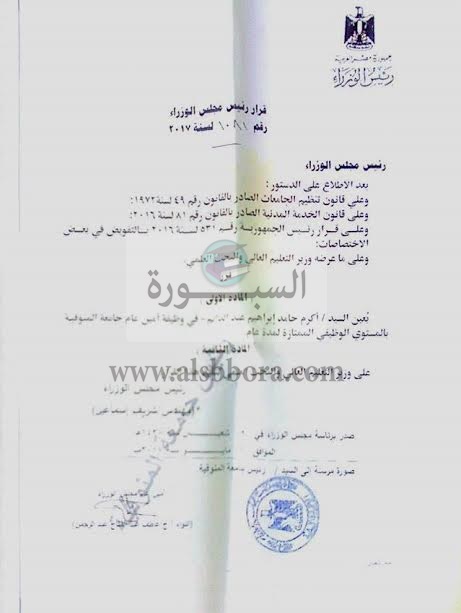 اصدر المهندس شريف اسماعيل رئيس مجلس الوزراء قراراً يحمل رقم 1081 لسنة 2017 بتعيين المحاسب أكرم حامد ابراهيم عبد الدايم فى وظيفة الامين العام لجامعة المنوفية لمدة عام .