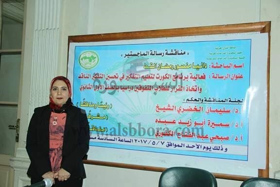 ومن جانبها أكدت الباحثة داليا منصور القط ، أنها سعيدة بحصولها على درجة الماجستير والتى يرجع الفضل فيها إلى جميع الأساتذة المشرفين والمناقشين وكذلك زملائها بالتربية والتعليم بكفرالشيخ، بالإضافة إلى أسرتها على دورهم البارز والفعال معها خلال الفترة الماضية .