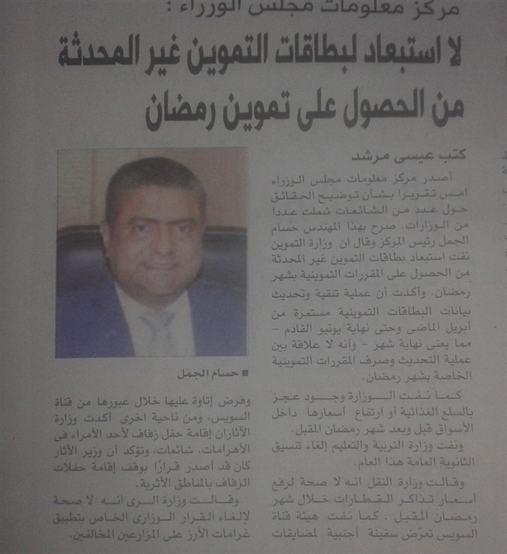 وقال ان وزارة التموين نفت استبعاد بطاقات التموين غير المحدثة من الحصول على المقررات التموينية بشهر رمضان.