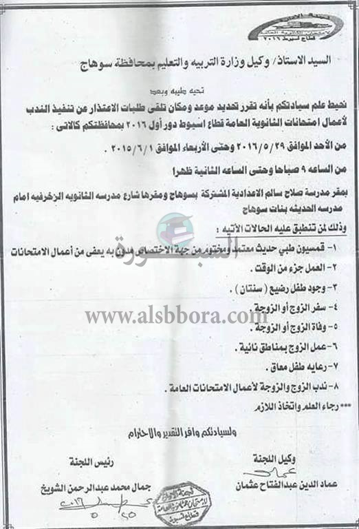 أعلنت مديرية التربية والتعليم بمحافظة سوهاج عن شروط الاعذار التى يجب على المديرية قبولها من المعلمين حال الاعتذار عن امتحانات الثانوية العامة.
