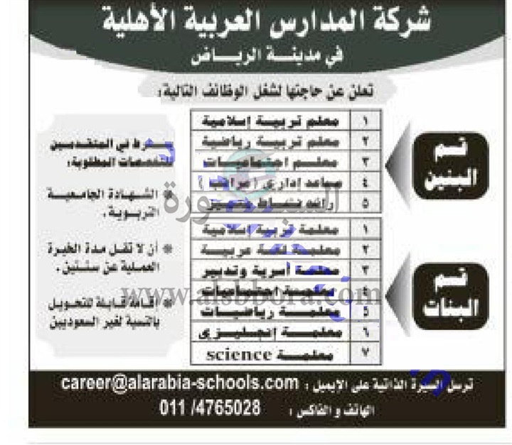 تعلن عدد من المدارس الكبري بالسعودية عن وظائف جديدة للمعلمين والمعلمات وذلك وفقا لنص الإعلان التالي:-