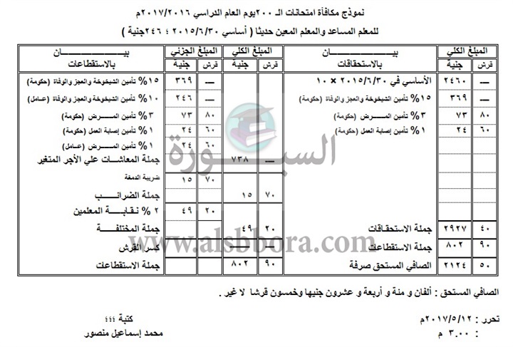 حيث يظهر النموذج خفض صافي مكافأة 2017/2016 عن العام الماضي للمعلم المساعد والمعلم المعين حديثا ( 2015 ) ولم يحصل على علاوات ضم خدمة بعد بمقدار ( 24.50 جنية ) .