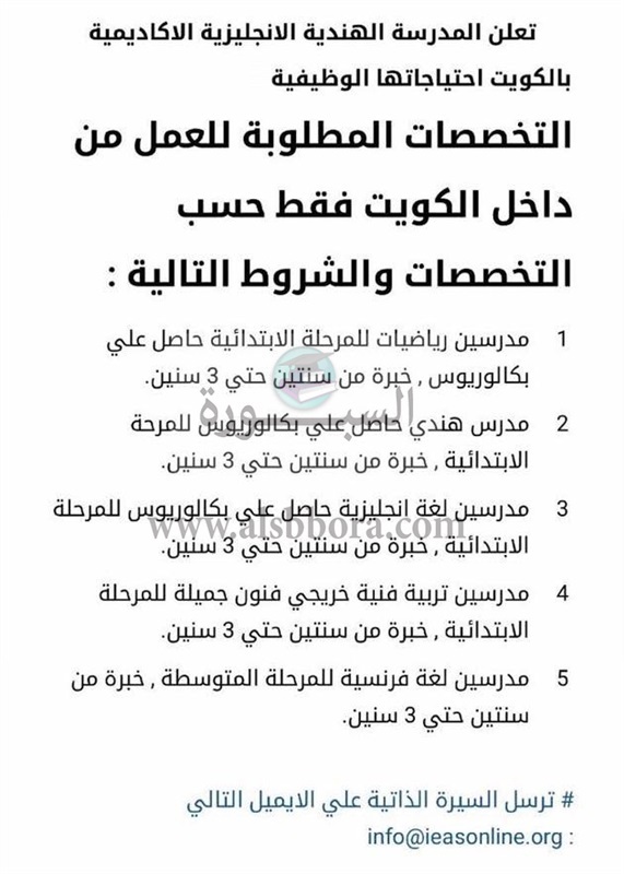 تعلن كبري المدارس الكويتية عن حاجتها للتعاقد مع معلمين ومعلمات في جميع المواد وذلك وفقا لنص الإعلان التالي:-