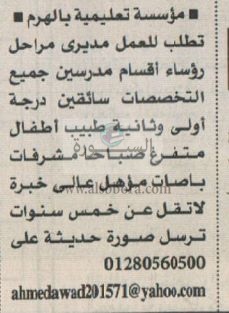 تعلن مدارس الهرم عن وظائف جديدة للمعلمين والمعلمات في جميع المواد وذلك في التخصصات الواردة في نص الإعلان التالي: