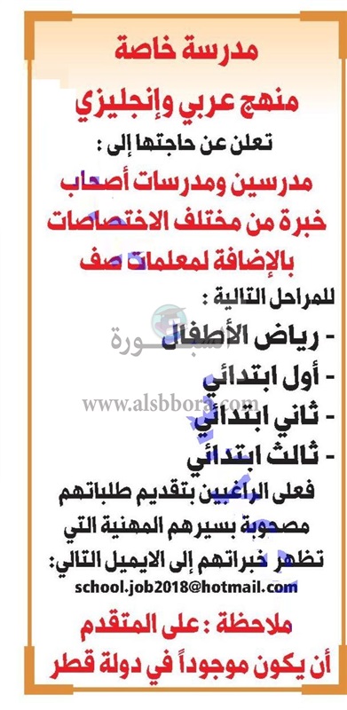 تعلن مدرسة خاصة في دولة قطر عن حاجتها للتعاقد مع معلمين ومعلمات وذلك في المواد الورادة في نص الإعلان التالي:-