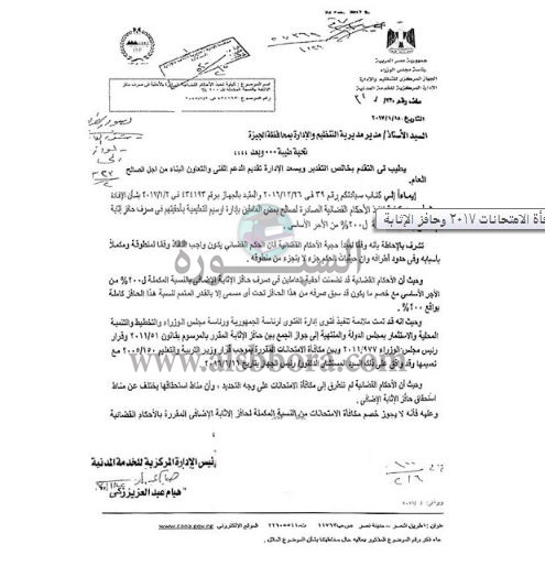 بالمستندات| التنظيم والادارة: لا يجوز خصم مكافأة الامتحانات من النسبة المكملة لحافز الاثابة الاضافى للمعلمين