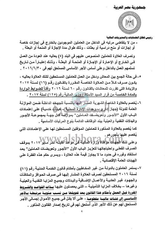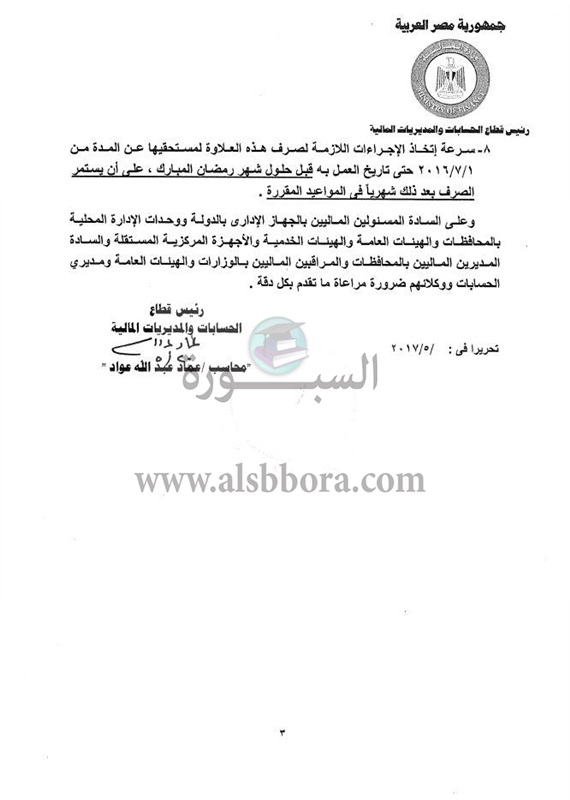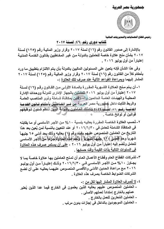 أصدر عمرو الجارحى وزير المالية، قرارًا وزاريًا حمل رقم 125 لسنة 2017، بقواعد صرف العلاوة الخاصة للعاملين بالجهاز الإدارى للدولة من غير المخاطبين بقانون الخدمة المدنية، والتى وافق مجلس النواب على منحها بنسبة 10% من الأجر الأساسى وبحد أدنى 65 جنيهًا وأقصى 120 جنيهًا، وتصرف اعتبارا من أول يوليو 2016 كما تضم للأجر الأساسى من ذلك التاريخ، وليس بعد 5 سنوات مثل العلاوات السابقة، وذلك تيسيرًا على العاملين بالجهات المستفيدة.. و"اليوم السابع" ينشر نص الضوابط.