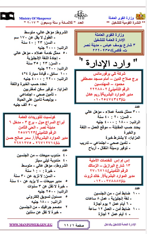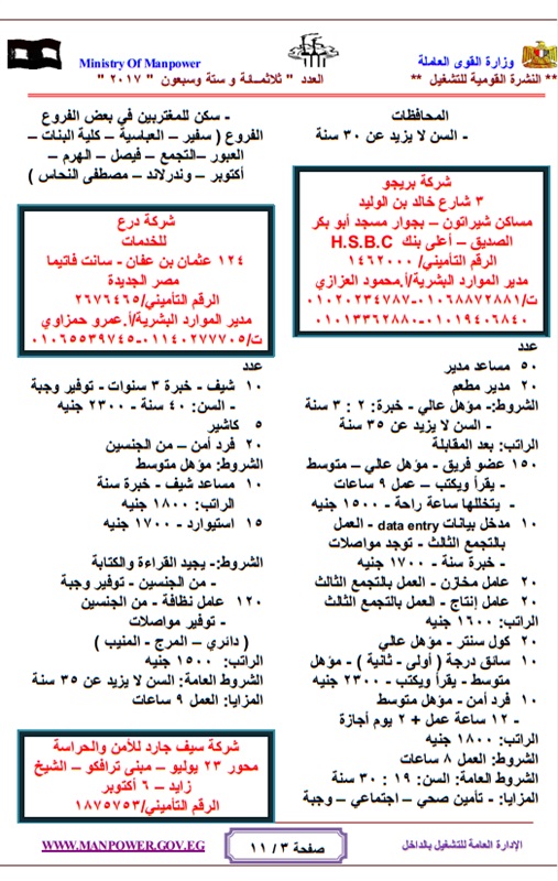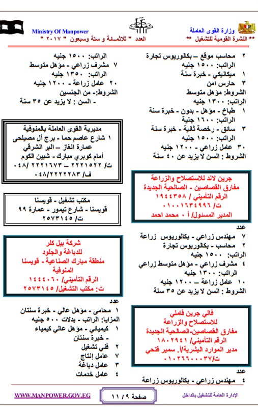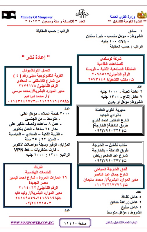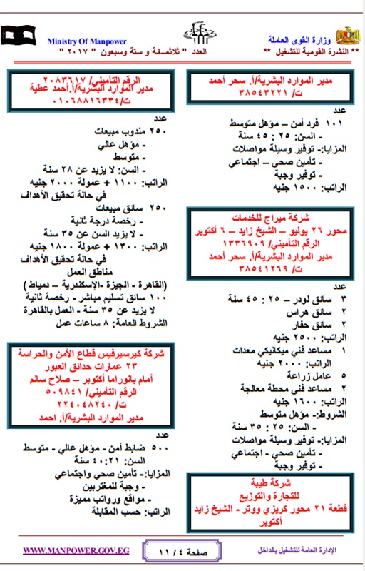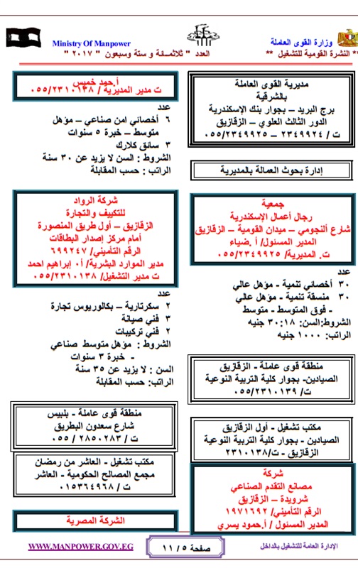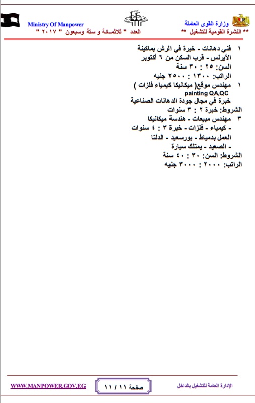 أعلنت وزارة القوي العاملة والهجرة " الحكومة المصرية "عن حاجتها لشغل عدد كبير من الوظائف للعمل بالهيئات والقطاعات والشركات المنتشرة فى انحاء الجمهورية وفقا للنشرة القومية للتشغيل والتى تعلن عن وجود 4480 فرصة عمل مطلوبة خلال شهر مايو 2017 ، حيث تتيح النشرة القومية للتشغيل فرص للعمل بالقطاع العام والقطاع الخاص داخل مصر .
