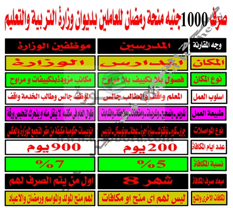 نشر نشطاء التعليم على موقع التواصل الاجتماعى "فيسبوك" كوميكس يقارن بين المعلمين وموظفى ديوان الوزارة من خلال صرفهم منح فى الاعياد والمواسم طوال العام، خاصة وأن الوزارة قد صرفت منحة بمناسبة شهر رمضان 1000 جنيه لجميع الموظفين فى الوزارة.