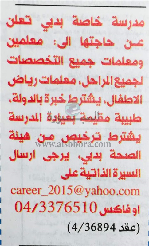 تعلن عدد من المدارس الإماراتية عن وظائف جديدة للمعلمين والمعلمات وذلك في جميع المواد وذلك وفقا لنص الإعلان التالي: