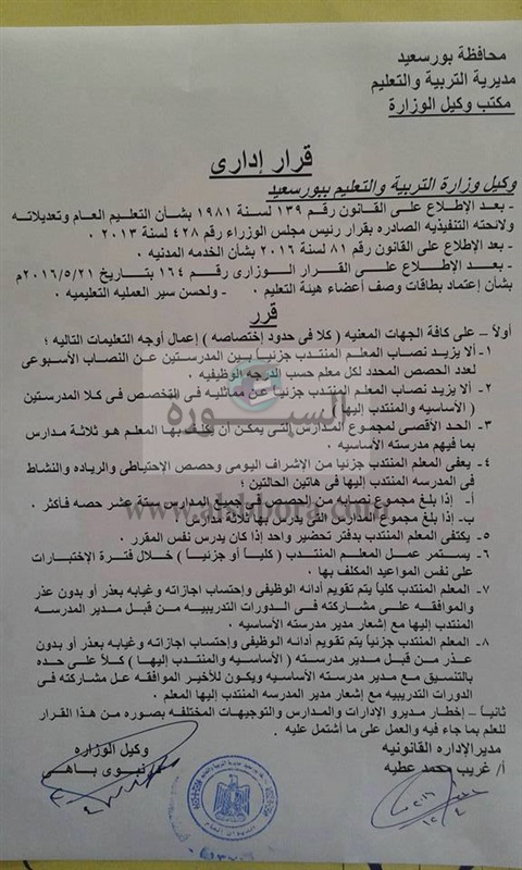 أصدرت وزارة التربية والتعليم بيانا اداريا هاما بشأن انتداب المعلمين والنصاب الأسبوعى للحصص والمعلم المنتدب جزئيا بين مدرستين.