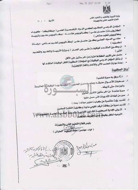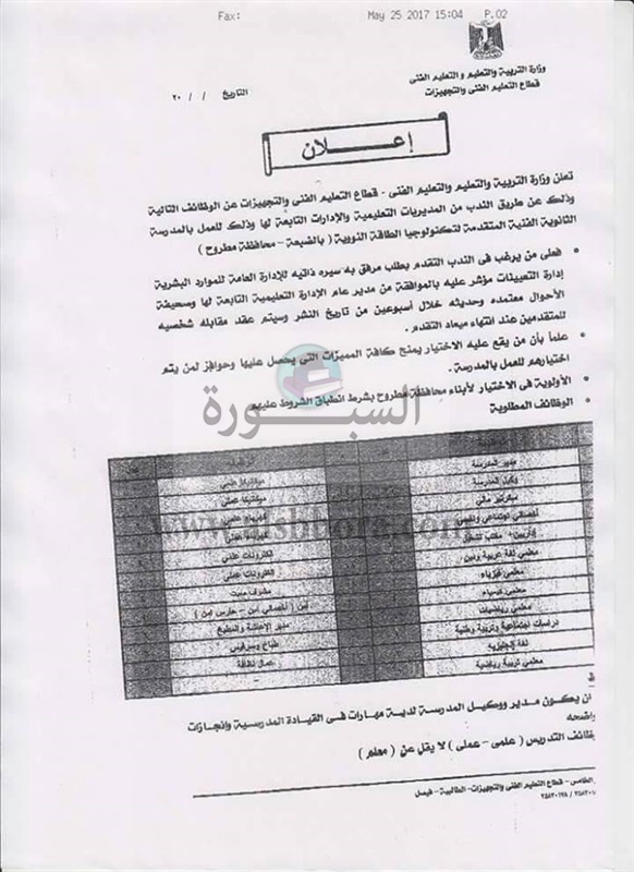 تعلن وزارة التربية والتعليم والتعليم الفنى عن الوظائف التالية عن طريق الندب من المديريات التعليمية والاداراى التابعة لها وذلك للعمل بالمدرسة الثانوية الفنية المتقدمة لتكنولوجيا الطاقة النووية "بالشبعة/ محافظة مطروح".