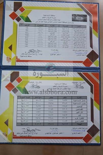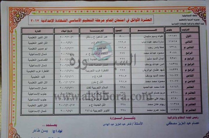 تصدرت البنات قوائم العشرة الأوائل في نتيجتي الشهادة الابتدائية والاعدادية بمحافظة الإسماعيلية للعام الدراسي الحالي 2016-2017 .