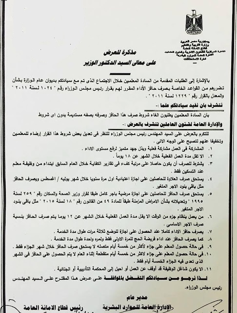حددت وزارة التربية والتعليم شروط استحاق حافز الاداء لشاغلى الوظائف التعليمية وأيام العمل الفعلية للعاملين بالتربية والتعليم وذلك بعد ورود العديد من الاستفسارات عن ايام العطلات والمناسبات الرسمية وهل هى ايام عمل فعلية ام لا ؟ وهنا جاء فاكس الادارة العامة لشئون العاملين بوزارة التربية والتعليم للايضاح ذلك طبقا لقرار مجلس الوزراء رقم 1024 بشان حافز الاداء لشاغلى الوظائف التعليمية والذى ينص فى مادتة الثانية على "انة يشترط لاستحقاق حافز الاداء المنصوص علية فى المادة الاولى من قرار مجلس الوزراء مايلى :-