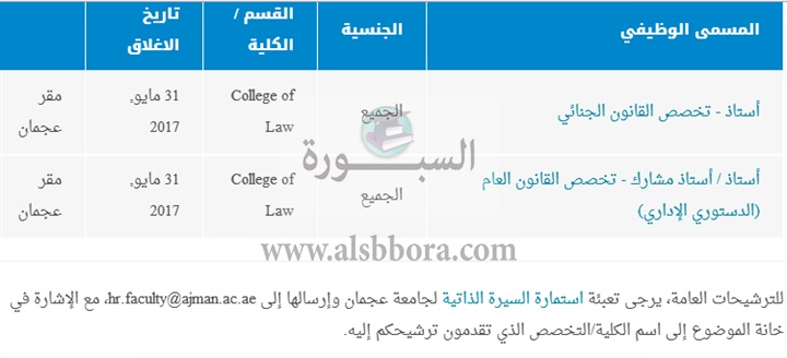 تعلن جامعة عجمان عن وظائف جديدة لأعضاء هيئيه التدريس "من حملة الماجستير والدكتوراه" وذلك وفقا لنص الإعلان التالي: