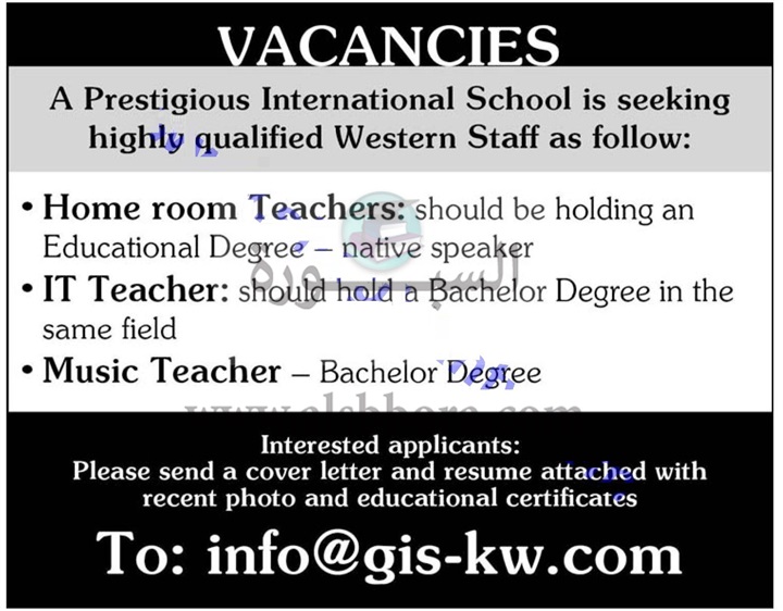 تعلن مدرسة خاصة في دولة الكويت تعلن عن وظائف جديدة للمعلمين والمعلمات وذلك وفقا لنص الإعلان التالي:-