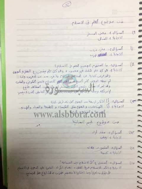 صور لإجابات امتحان اللغة العربية والتربية الدينية.