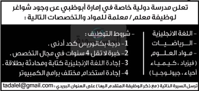تعلن مدرسة خاصة في الإمارات عن وظائف جديدة للمعلمين والمعلمات وذلك في المواد الواردة في نص الإعلان التالي: