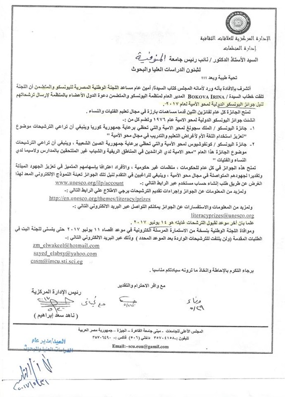 أخبار الجامعات تعرف على شروط الترشيح للحصول على جائزه اليونيسكو الدولية لمحو الأمية 2017 المنوفية - رشا الشريف الثلاثاء 06/يونيو/2017 - 01:03 م facebook twitter whats x facebook twitter rss feed facebook twitter whats