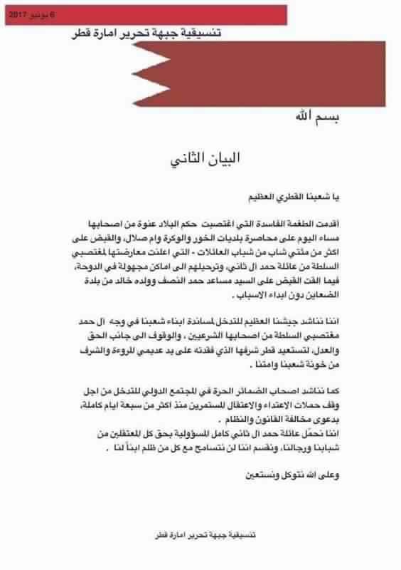 جبهة تحرير قطر تصدر البيان الثانى لها