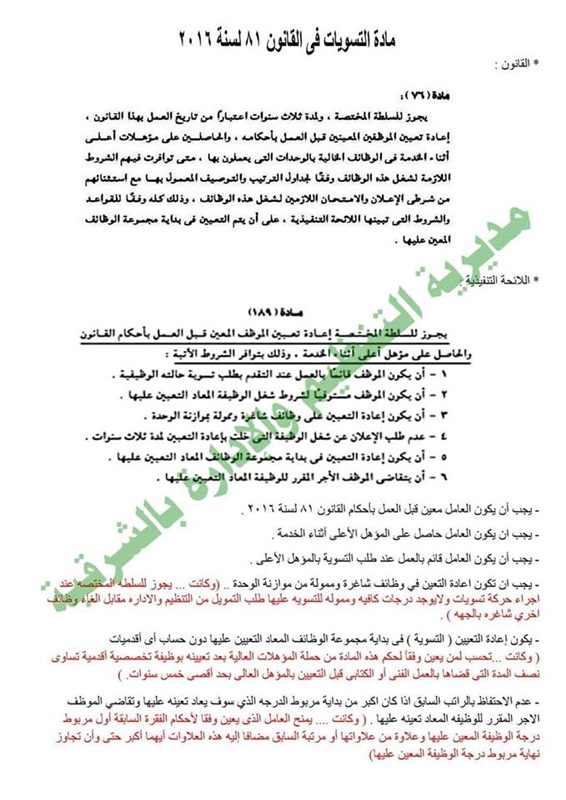 ينشر موقع السبورة ما أعلنته مديرية التنظيم والادارة بمحافظة الشرقية بخصوص مادة التسويات للمؤهلات العليا للحاصلين عليها اثناء الخدمة والمنصوص عليها فى قانون 81 المعروف اعلاميا بقانون الخدمة المدنية.
