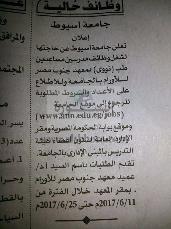اعلنت جامعة اسيوط عن حاجتها الى اعضاء لهيئة التدريس وفقا للاعلان التالى