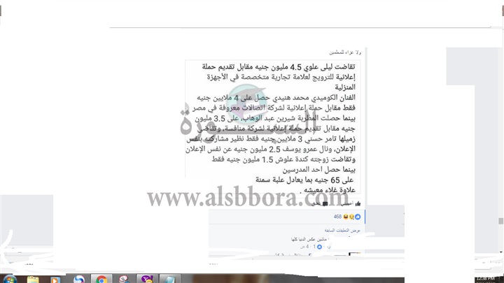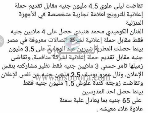 واضاف النشطاء تقاضت ليلي علوي4.5 مليون جنيه مقابل تقديم حملة إعلانية للترويج لعلامة تجارية متخصصة في الاجهزة المنزلية وغيرها من الفنانين من بينهم المطربة شرين والفنانة كندة علوش والمطرب تامر حسنى.