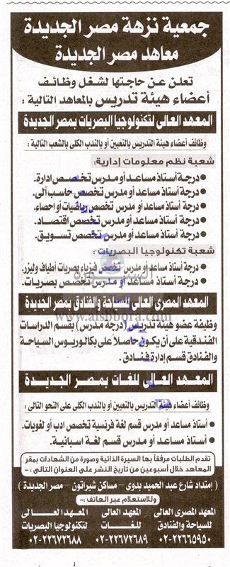 تعلن معاهد مصر الجديدة عن وظائف جديدة لأعضاء هيئة التدريس في 11 تخصص "من حملة الماجستير والدكتوراه" وذلك وفقا لنص الإعلان التالي:-