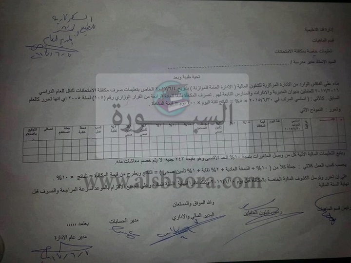 تنشر "السبورة" فاكس تعليمات مكافأة الامتحانات 2017 وكيفية تحديد نسبة الخصم