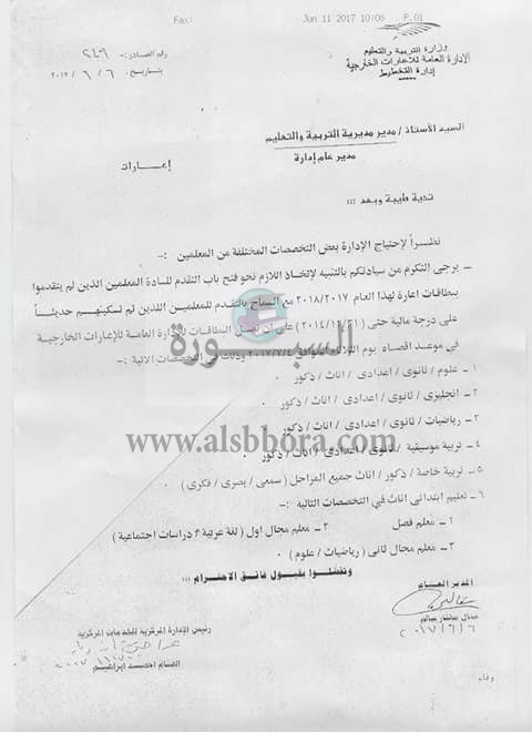 أصدرت الإدارة العامة للإعارات الخارجية بإدارة التخطيط بوزارة التربية والتعليم عن إعادة فتح باب التقدم المعلمين للإعارة الخارجية وذلك نظراً لاحتياج الإدارة لبعض التخصصات المختلفة.