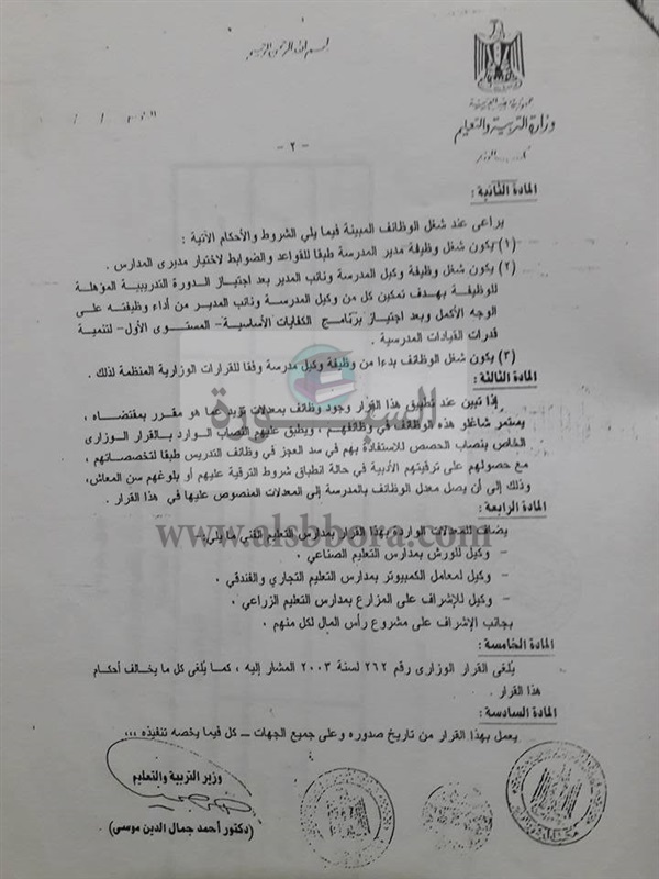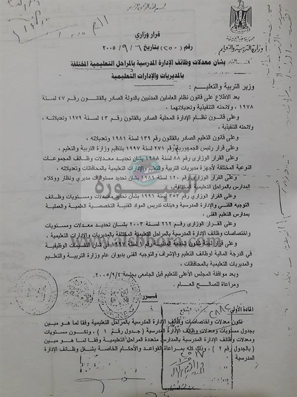 ننشر القرار الوزارى رقم 250 بشأن معدلات وظائف الادارة المدرسية بجميع المراحل والمديريات والادارات التعليمية