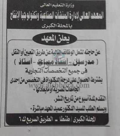 يعلن المعهد العالى لادارة المنشآت الصناعية وتكنولوجيا الانتاج بالمحلة الكبرى بمحاظة الغربية عن حاجته الى مدرسين واستاذ مساعد واستاذ فى جميع التخصصات التجارية.