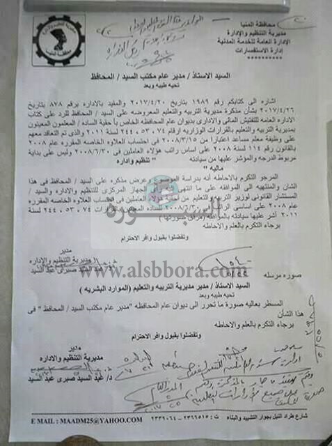 مديرية التنظيم والادارة بمحافظة المنيا إلي مدير عام مكتب محافظ المنيا بشأن