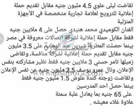 حصول ليلى علوى على 4.5 مليون جنيه فى حملة اعلانية.. والمعلم على 65 جنيها غلاء معيشة ثمن "علبة سمنة"!!