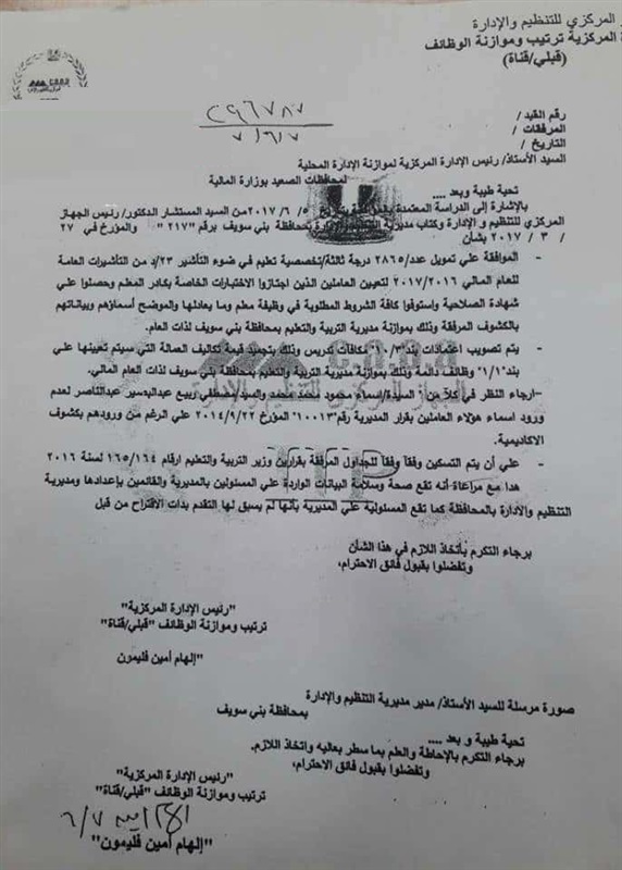 اصدر جهاز التنظيم والإدارة بمحافظة بنى سويف قرارلتعيين 2863 معلم ومعلمة لمحتلف التخصصات بمحافظة بني سويف، جاء هذا بعد الدراسة المعتمدة بتاريخ 5/6/2017 من رئيس الجهاز المركزي للتنظيم والإدارة، وكتاب مديرية التنظيم والإدارة بني سويف برقم 217 والمؤرخ في 27/3/ 2017 . لجميع المعلمين الذين حصلوا على شهادة الصلاحية واستوفوا كافة الشروط لتعيين على وظيفة معلم