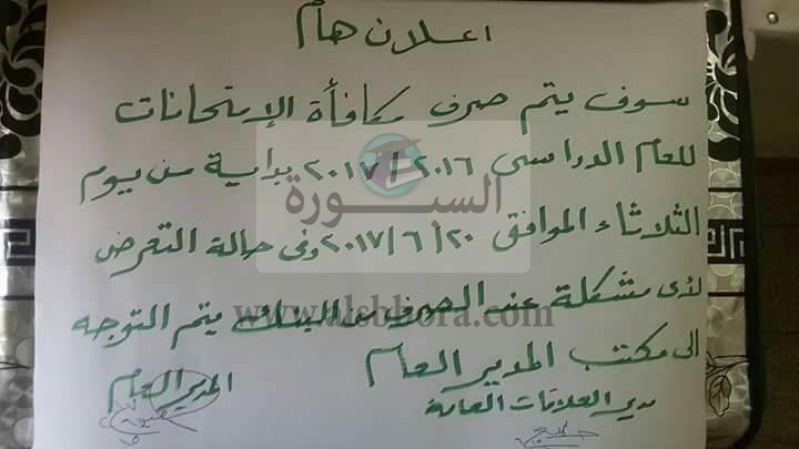 وجاء فى الاعلان انه سوف يتم صرف مكافأة الامتحانات للعام الدراسى 2017/2016 بداية من يوم الثلاثاء المقبل الموافق 20 يونيو 2017 وفى حالة التعرض لأى مشكلة عند الصرف من الينك يتم التوجه الى مكتب المدير العام.