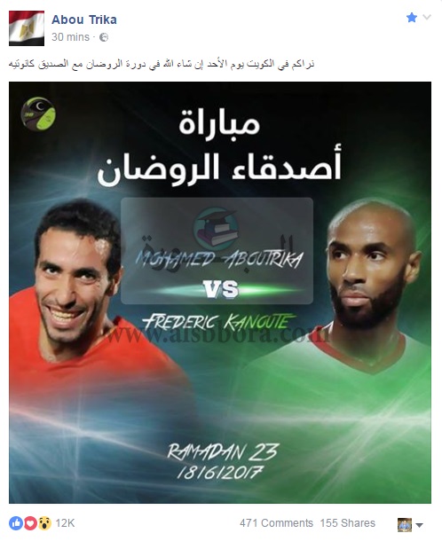 وأفصح أبو تريكة عن مشاركته في دورة الروضان بالكويت بعد غد الأحد برفقة النجم المالي فريدريك عمر كانوتيه أسطورة منتخب مالى وأشبيلية الإسبانى السابق.