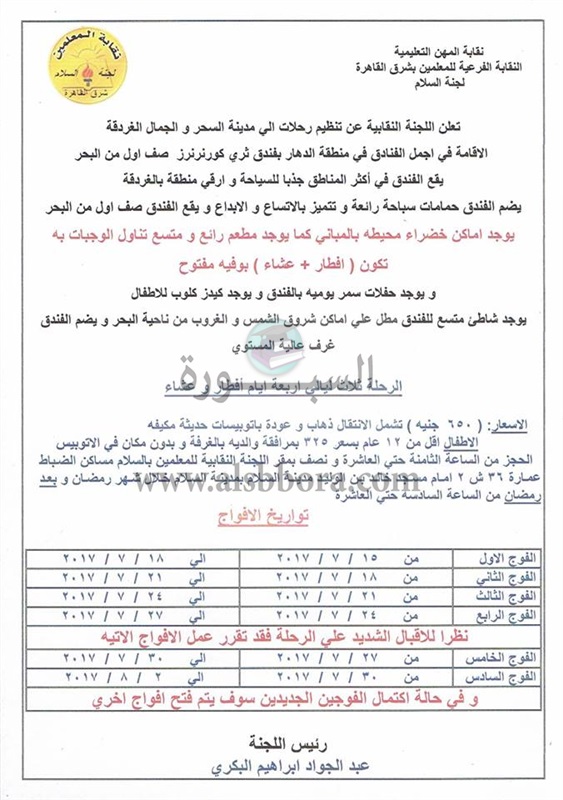 تعلن النقابة الفرعية للمعلمين بشرق القاهرة عن تنظيم رحلات الى مدينة الغردقة للمعلمين، على ان تشمل الرحلة 3 ليالى اربعة ايام، ووجبتين افطار وعشاء، بمبلغ 650 جنيها، والحجز طوال شهر رمضان من الساعة العاشرة والنصف بمقر النقابة.