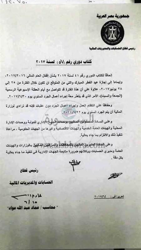 أصدرت وزارة المالية كتاب دوري هام لجميع الوزارات والهيئات الحكومية واجب التنفيذ 22 يونيو الجاري.