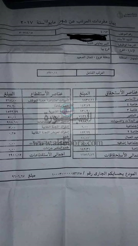 بالمستندات| بيان مفردات ساعي ببنك مصر : اجمالى الاستحقاقات 12516 جنيه والشامل 8970 جنيه لشهر مايو.. ولا عزاء للمعلمين