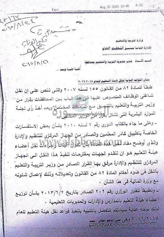 ينشر موقع السبورة القرار الوزارى رقم 202 الصادر من وزير التربية والتعليم بشأن نقل وندب المعلمين، والذى جاء كالتالى: