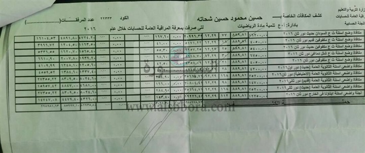 حصلت " السبورة " علي كشف مكافآت احد مستشاري المواد بوزارة التربية والتعليم والذي تضمن حصيلة اللجان المكافآت الأعمال الإضافية خلال 10 شهور فقط ، غير راتبه وحوافزه ومكافأة الامتحانات تصل الي 300 الف جنيه