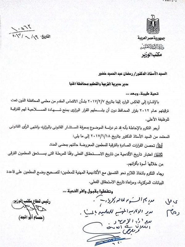 بالمستندات|التعليم تقبل التماس المعلمين وتوافق على منحهم الترقى للوظيفة الاعلى