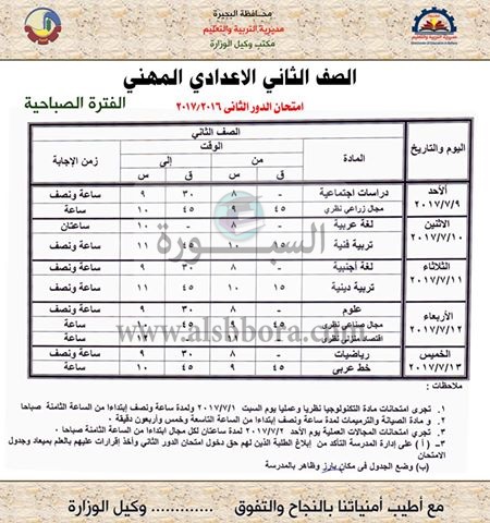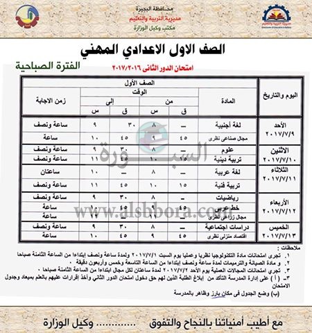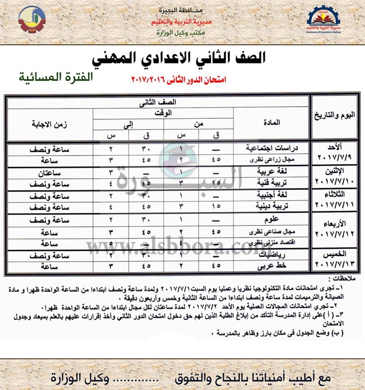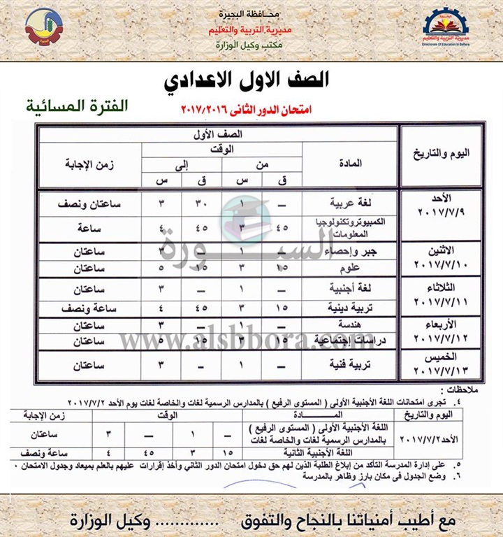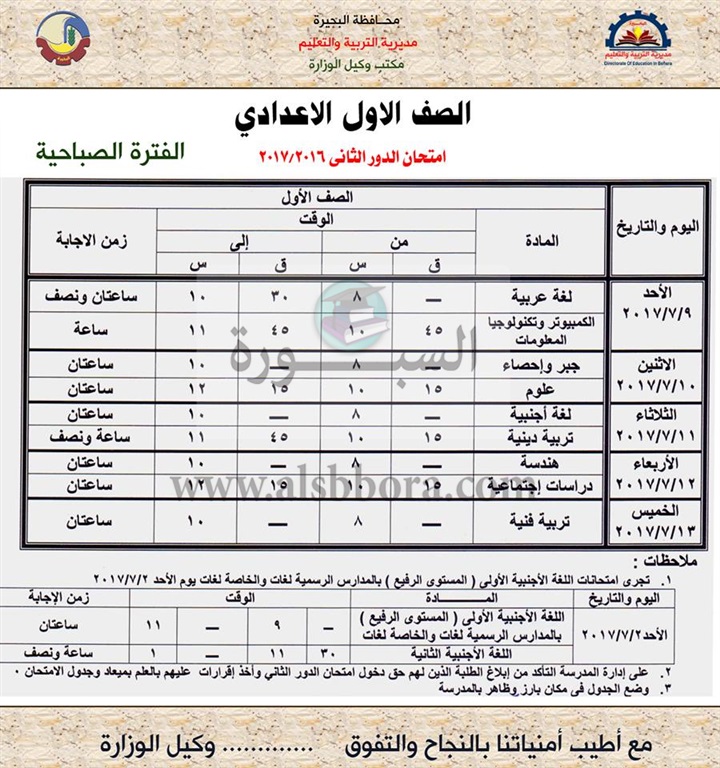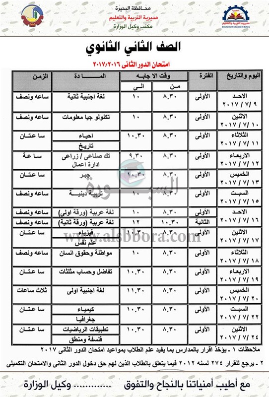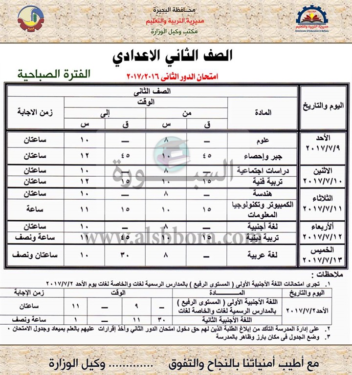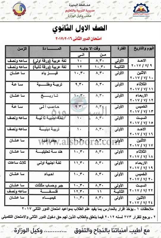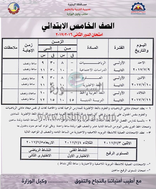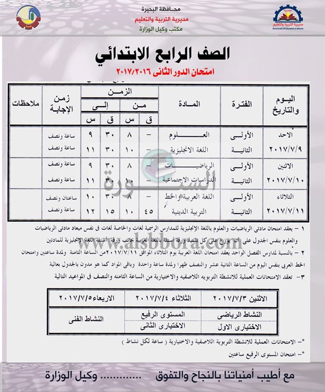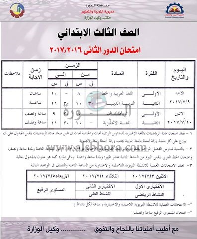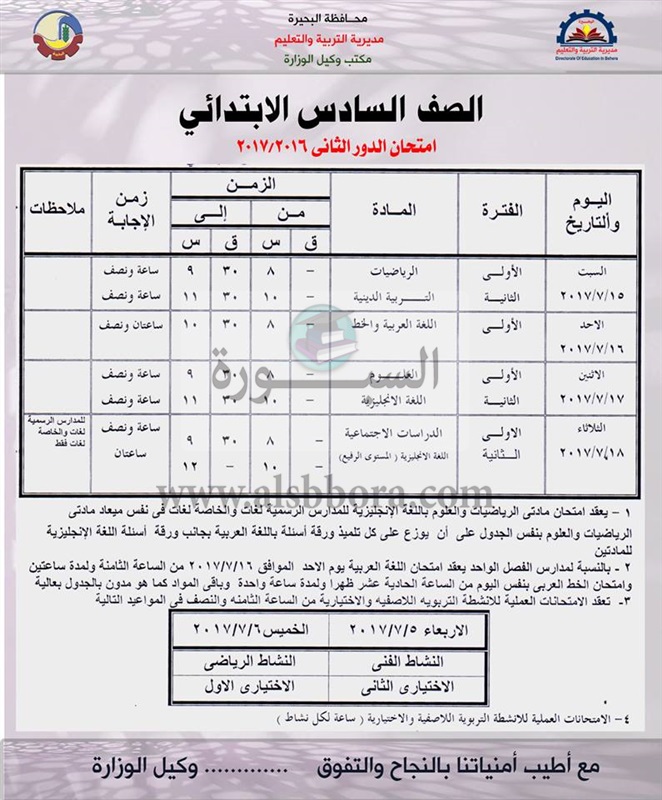 أعلنت مديرية التربية والتعليم بمحافظة البحيرة برئاسة محمد سعد جدول امتحانات الدور الثاني لصفوف النقل بالمرحلة الابتدائيةوالاعداديةوالثانوى وتبدأ الامتحانات 9 يوليو وتنتهي 18 يوليو المقبل.