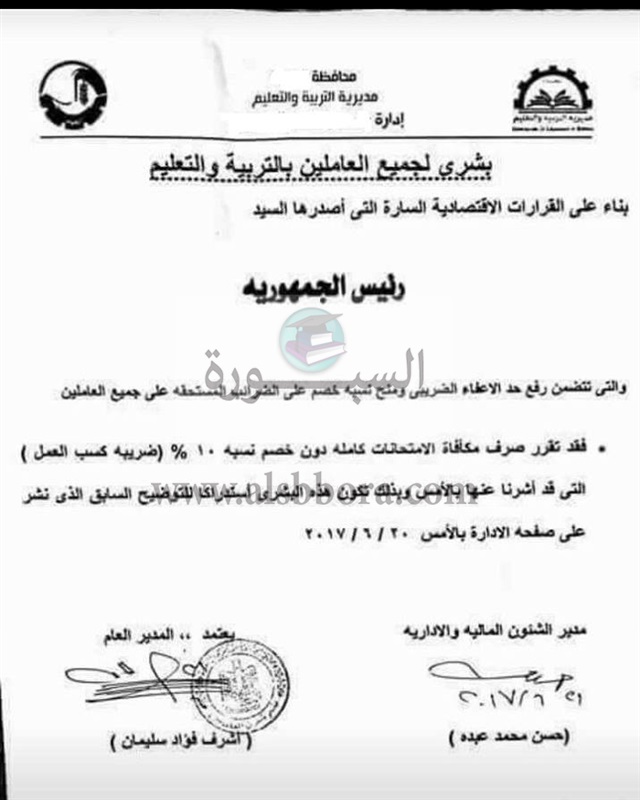 ارسلت مديريات التربية والتعليم فاكسا هاما بعدم خصم اى ضرائب من مكافات الامتحانات