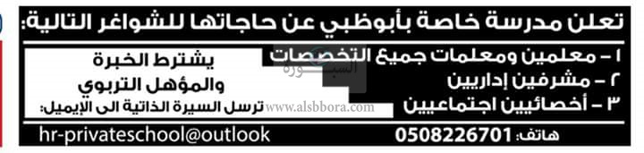 تعلن مدارس أبوظبي في الإمارات عن وظائف جديدة للمعلمين والمعلمات في جميع المواد وذلك وفقا لنص الإعلان التالي:-
