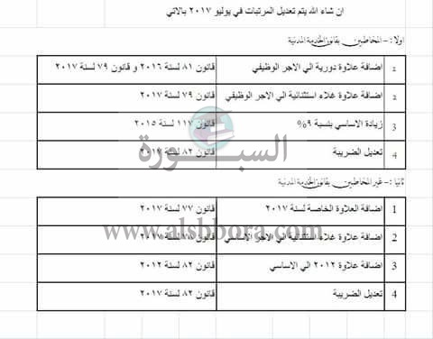 ينشر موقع السبورة التعديلات المرتقبة فى أول يوليو 2017 للموظفين الخاضعين لقانون الخدمة المدنية غير الخاضعين واضافة العلاوات الخاصة والاستثنائية، بالاضافة الى علاوة 2012، وتعديل الضرائب بالقوانين التى أعلنتها وزارة المالية.
