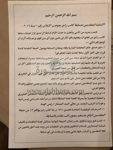 واشار البيان إلى أن عدد المتقدمين سبعون الف متسابق ورغم ذلك شهد الجميع بحسن التنظيم، يذكر أن المطلوب 1591لوظيفة كاتب رابع بهيئة النيابة الإدارية على مستوى الجمهورية بالمسابقة رقم 1لسنة 2016.